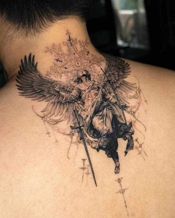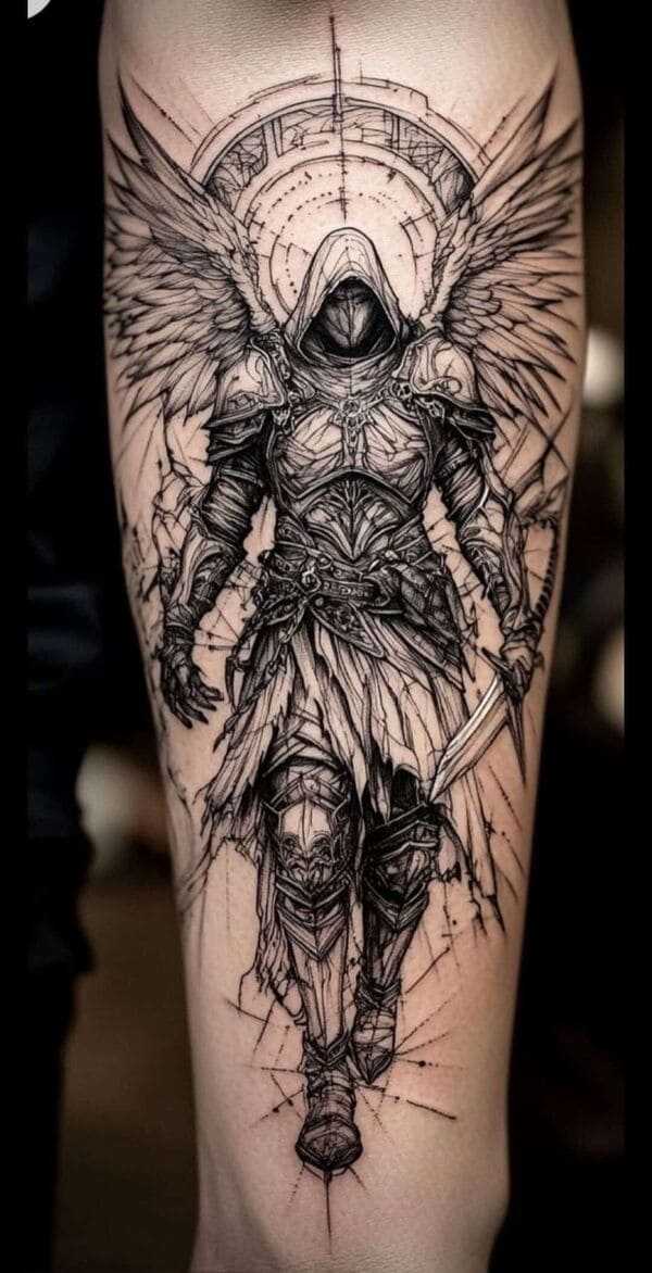 Saint Michael is the archangel in Christianity who leads the heavenly army against evil. Archangel Michael tattoos represent strength, courage, and an unwavering fighting spirit. This warrior angel tattoo style is especially popular among men, military veterans, and those with strong Christian faith.