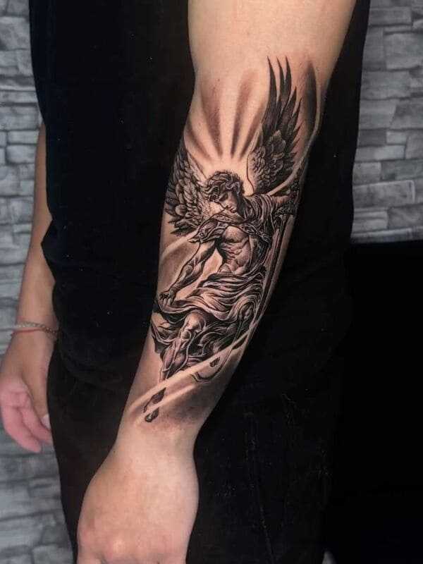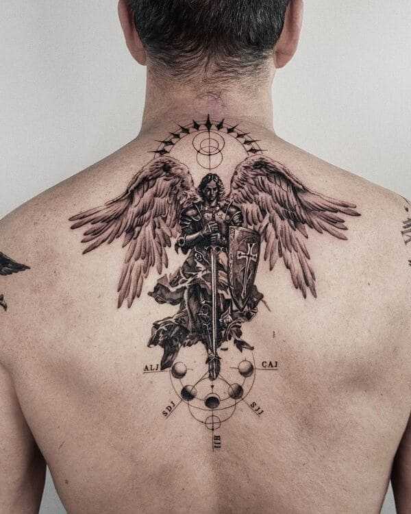 Angel tattoos for men often lean toward bold, masculine styles. Warrior-inspired imagery or fallen figures—featuring broken wings or a descending form—are commonly used to represent inner struggle or a challenging past. Popular placements include the arm, chest, or back, allowing for larger compositions and strong visual impact.